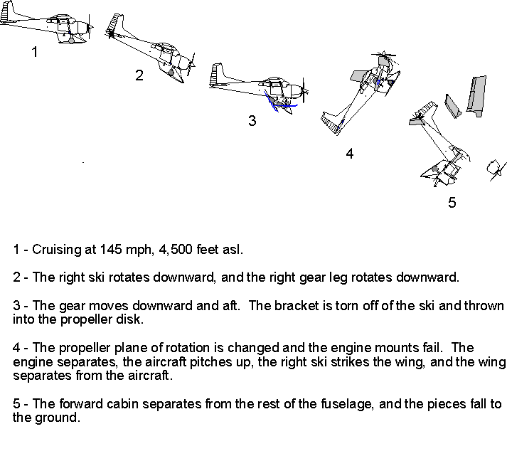 When the engine separated, the aircraft pitched up as a result of aerodynamic forces and the shift in its centre of gravity. The ski then cut the right wing strut and the leading edge aft to the main spar. During this sequence, the forward carry-through structure was damaged, allowing the two wings to tear off. Finally, lacking a viable structure, the fuselage separated at the aft door pillar. Transfers of colour from the ski were also found on the vertical stabilizer and left elevator, suggesting that the fuselage rotated to the right after losing the right wing. After a descent of about 3,500 feet, the various pieces crashed on the ground.