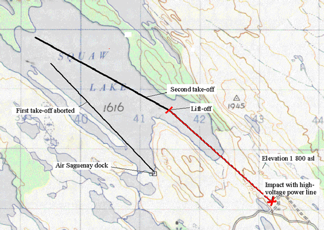 Squaw Lake is oriented northwest/southeast and is about two and a half miles long (see Appendix C). To the southeast, at the end of the lake, there is a valley between two hills. The elevation of the lake is 1,616 feet above sea level (asl), whereas the elevation at the first point of impact of the aircraft was 1,800 feet asl. The aircraft apparently covered about 8,000 feet before lifting off, and apparently flew for about 8,000 feet before striking the ground. The pilot stated that he realized that the aircraft was not achieving its usual performance during the initial climb. During the take-off run, the aircraft travelled for a longer than normal distance before taking off. The pilot attributed that situation to the tail wind. Normally, once the aircraft was flying, the pilot lowered its nose to retract the flaps and allow the aircraft to accelerate at the best rate of climb. In this case, the pilot could not retract the flaps because of the shoreline and the obstacles that were quickly approaching. He pulled back on the controls and tried to gain altitude while maintaining a speed of approximately 80 mph, with the flaps still down 15 degrees. The pilot attempted to clear the obstacles on his flight path, but when the high-voltage wires appeared ahead, he could not take evasive action to clear the obstacle. The aircraft struck the high-voltage lines and a wooden pole, then went nose down and pivoted around the pole before crashing on the ground. An intense fire broke out after the aircraft came to rest.