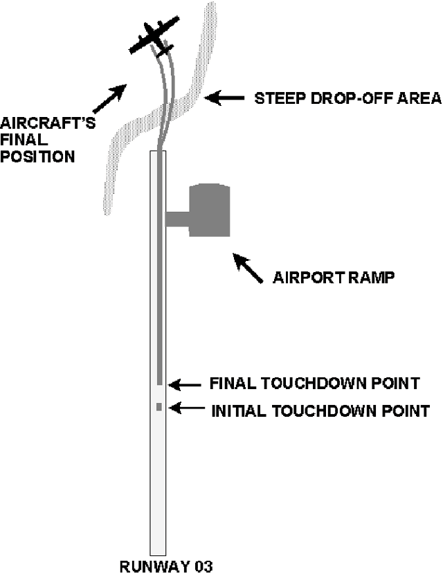 A 200-foot gravel turn-around area is located past the lights marking the end of runway 03. The area north of this turn-around area is comprised of a relatively even gravel and clay ground in the first 100 feet; the ground then transitions to a steep drop-off area containing a number of large rocks. The difference in elevation from the runway end markers to the aircraft's final position was 21.3 feet (a down-slope of 4.26 per cent).
