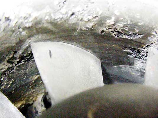 The interior of the fan housing adjacent to the running path of the fan blades was also severely corroded. One area where the surface coating remained, however, exhibited minor rotational scratches.