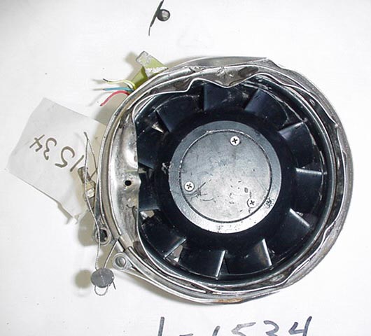 The fan was recovered as a single unit. It was identified by tag as EG&G Rotron PN 034964, SN A01556, and Swissair ASN 0001, IDN 474986.The fan retained a metal V-shaped band clamp on the fan housing inlet, but the associated ducting had broken away. The fan housing was broken at mid-span, adjacent to the stator blades on the exhaust or fan outlet side (which faces forward in the aircraft).