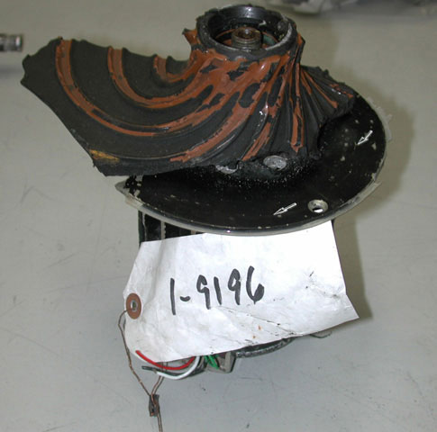 Etched into the housing body was PN 605138-3 R (code ident) 70201. The hub of the composite centrifugal impeller was attached to the motor. The impeller blades and outer periphery of the impeller, however, had broken away. The flanged end of the motor housing assembly had also broken away. Deep rotational gouge marks were noted in two locations on the underside of the impeller. One gouge mark aligned with the outer periphery of the broken flange and the other mark aligned with the broken edge of the motor housing.
