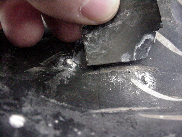 A faint, arc-shaped mark was noted on the underside of one of the detached pieces that matched the location and pattern of the rotational gouges exhibited on two of the other fan impellers.