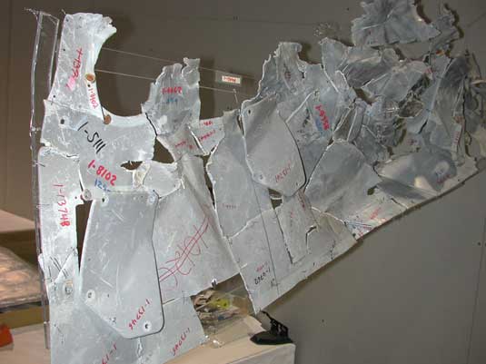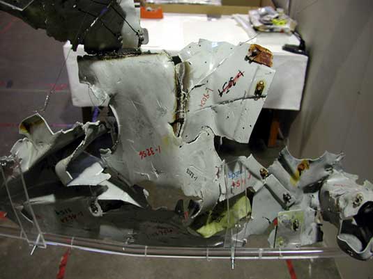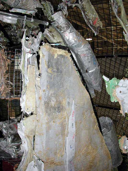 When the resolidified aluminum was removed from the lap belt, a white deposit remained. Other white deposits were observed elsewhere on the same lap belt. Trace analysis of these white deposits identified their composition as being primarily aluminum oxide. Microscopic fibre analysis identified fused, heat-damaged lap belt material at each location where the aluminum oxide deposits were found. These other white deposits were determined to be from locations where molten aluminum had once been deposited. The precise alloy of the aluminum from these latter locations could not be determined. It cannot be determined at what point during the flight sequence, impact sequence, or both that these deposits were made.