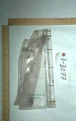 Portions of the blow-out panel were recovered. The aluminum covering had separated from both the forward and aft para-aramid fibre grill panels; however, pieces of aluminum were identified as having been installed on the para-aramid fibre door grill panels. There was no evidence of heat damage or soot accumulations on the forward or aft para-aramid fibre grill panels or the aluminum covering. The certificate holder was recovered. The holder was deformed between the two vertical sides. An area of black discolouration, measuring 2.5 cm (1 inch) wide and 3.8 cm (1.5 inches) high, was observed near the lower right corner of the holder; the top edge of the certificate holder exhibited slight, melt-like characteristics.