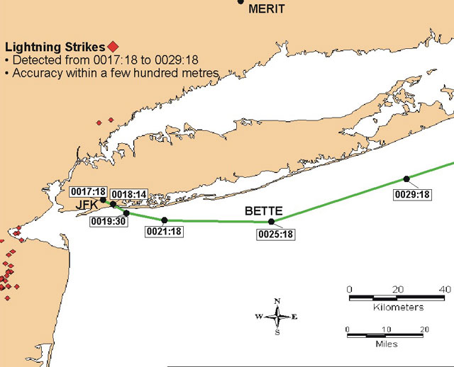 The closest cloud-to-ground lightning activity was located approximately 23 nm from the SR 111 track. It is common for horizontal components of cloud-to-ground lightning to channel within a cloud or through several clouds for up to 5 to 10 miles. Once the aircraft was past the BETTE intersection at 0025, all cloud-to-ground lightning and thunderstorm activity was well behind it for the remainder of the flight.