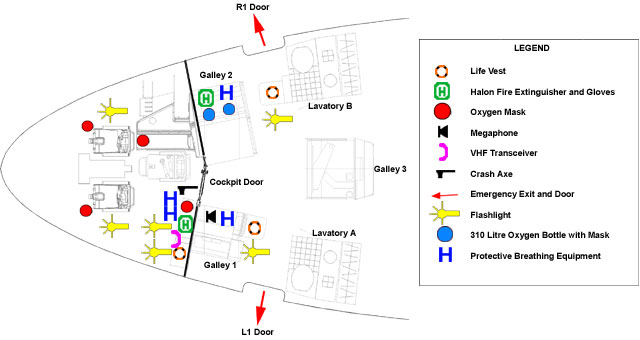 First aid and cabin crew oxygen was stored in twelve 310 L oxygen cylinders, located at various points in the passenger cabin. Four 120 L portable oxygen cylinders, with masks, were also stowed in the passenger cabin.