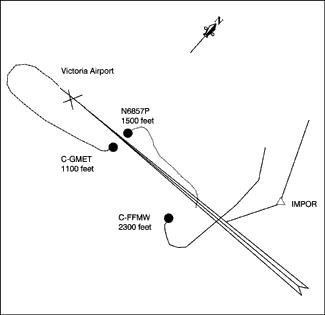 At the time N6857P received the visual approach clearance, C-GMET, flying under visual flight rules (VFR), was established in the left-hand circuit pattern for runway 27 and was in communication with the Victoria tower. At 1046:38, the Victoria tower airport controller had instructed C-GMET to extend the downwind leg because there were several IFR aircraft on final for runway 27. At 1047:08, C-GMET was assigned the number three position for landing behind N6857P. When the airport controller saw that N6857P was being vectored north of the approach, he became uncertain as to the terminal controller's intention with respect to N6857P. As a result, the airport controller instructed C-GMET to continue downwind, and stated that he would advise the aircraft when to turn to base leg.