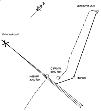 The trainee had cleared N6857P to fly a heading of 360 degrees and to maintain an altitude of 3000 feet. The trainee had informed the pilot of N6857P that the flight was to be number four, behind C-FFMW, for landing at Victoria. At 1041:45, the trainee advised the airport controller in Victoria tower during a 14-second exchange that he had rearranged the arrival sequence to place N6857P as number two, behind an instrument flight rules (IFR) arrival already established on the ILS approach and ahead of C-FFMW. However, at 1045:11, the trainee notified N6857P that the sequencing plan would not work, and he instructed the pilot of N6857P to climb to 4000 feet and to turn left to a heading of 340 degrees. Six seconds later, while still at his position at the adjacent console and without coordinating with the trainee, the OJI took over control of the arrival traffic. He instructed N6857P to turn further left to a heading of 300 degrees and to descend to 3000 feet. Shortly thereafter, he instructed N6857P to turn left to a heading of 280 degrees to intercept the final approach course. At the same time, he instructed C-FFMW to turn left onto a heading of 170 degrees and to descend to an altitude of 2500 feet. He advised the pilot that he was going to vector the aircraft through the localizer for spacing.