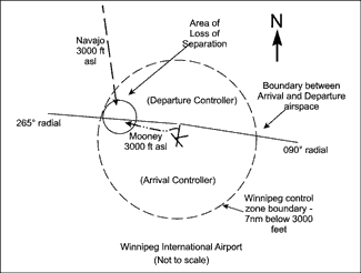 C-GRNE, a Piper PA-31 Navajo, was on arrival to Winnipeg International Airport (the airport), on radar vectors for a left-hand approach to runway 36. The arrival controller had cleared the aircraft to descend to 3000 feet. C-GKGY, a Mooney M20C departing on an instrument flight rules flight plan off runway 36, was given a left-turn heading of 270 degrees and cleared to climb to 6000 feet by the departure controller. As they passed 5 nautical miles (nm) west of the airport, the separation between the two aircraft was 0.53 nm lateral and 300 feet vertical. The required separation in this area was 3 nm lateral or 1000 feet vertical.
