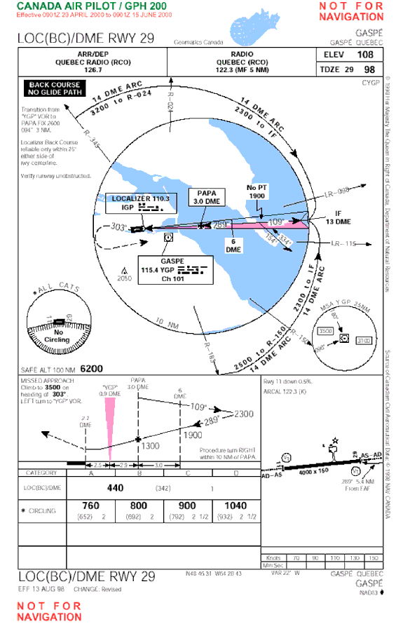 According to the instrument approach chart LOC(BC)/DME RWY 29, the minimum altitude is 440 feet above sea level (asl), 336 feet above ground level, and the minimum horizontal visibility must be 1 nautical mile (nm). The pilot advised the Québec FSS specialist that he was going to make a back course (BC) approach on runway 29 at Gaspé. This approach brings the aircraft successively to an altitude of 2300 feet asl on the 14 nm DME (distance-measuring equipment) arc and to 440 feet asl, the decision height that must be maintained until 2.7 nm DME, the threshold of runway 29. If the crew has not established visual contact with the runway or the runway lights at this height and distance, they must make a missed approach. A missed approach involves climbing to 3500 feet asl on a magnetic heading of 303 ° and then making a left turn to the Gaspé VOR (very high frequency omnidirectional radio range). (See Appendix A.) All the navigation systems required for the approach were serviceable on the day of the accident.