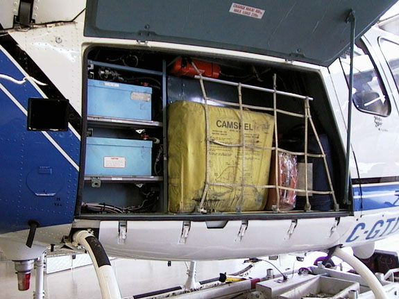 The right baggage compartment is located immediately forward of the battery compartment on AS 355 helicopters (see Appendix A). The compartments are separated by a 0.050-inch-thick aluminum bulkhead. The company used the right baggage compartment in each of the four company helicopters for storage of the required survival and emergency equipment. The survival and emergency equipment included a five-person survival shelter and a survival kit that contained emergency flares. The bags that housed the survival shelter and the emergency kit were made of flammable nylon, and the survival shelter was also packaged in a waxed cardboard box. The bags were not required by regulation to be flame-resistant, and during testing, the packaging materials ignited quickly, melted, dripped and were totally destroyed by fire. The burning characteristics did not meet the requirements of any existing flame-resistant textile specifications. The survival kits contained two hand-held, marine-type, parachute flares and four day/night smoke flares. The emergency flares in two of the three survival bags in the company sister ships were packaged in newspaper to prevent abrasion and the flares in the third survival bag were rolled in cardboard. The flares are packaged and transported as dangerous goods when shipped from the manufacturer; however, current Transportation of Dangerous Goods Regulations do not apply to products identified as dangerous goods if the dangerous goods are necessary for the safety of the persons on board the means of transport.