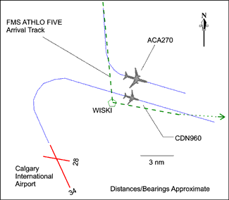 Runway 34 was being used for departures, and runway 28 was being used for arrivals. This results in crossing tracks for aircraft arriving from the north and those departing to the east. On initial descent to Calgary, ACA270 was cleared for the FMS ATHLO FIVE arrival procedure with an initial clearance from Calgary Terminal to descend to 12 000 feet. If the procedure is flown without changes directed by air traffic control, the aircraft would not descend below 10 000 feet until after passing the WISKI fix, which is south of the area of the loss of separation.