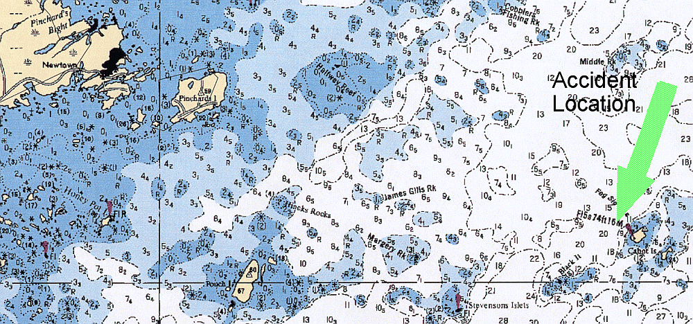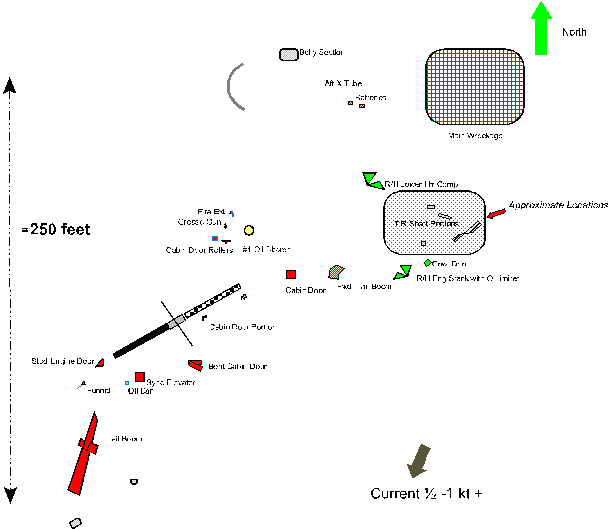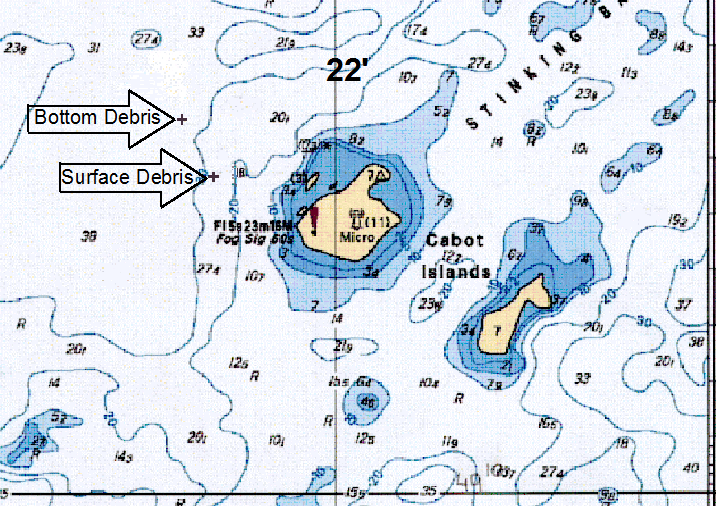 The floating debris was located immediately and recovered by local surface craft. Underwater search operations commenced on May 11 at 2300 using an underwater remotely operated vehicle. The underwater search, which was hampered by adverse weather, rough bottom conditions, and extensive underwater currents, continued until aircraft debris was located late in the evening on May 20. The main wreckage and the pilot were located the next day, 0.3 nm west-northwest of Cabot Island at a depth of 110 feet. The debris field was about 250 feet long, with the main cabin area to the northeast. The distribution of wreckage items was consistent with the tidal current. Less-dense components, such as the main rotor, panels, and the tail boom, were deposited to the southwest (see Appendix A). The wreckage was approximately 600 feet farther out from, and in line with, the estimated location of the floating netload of barrels observed immediately after the accident.