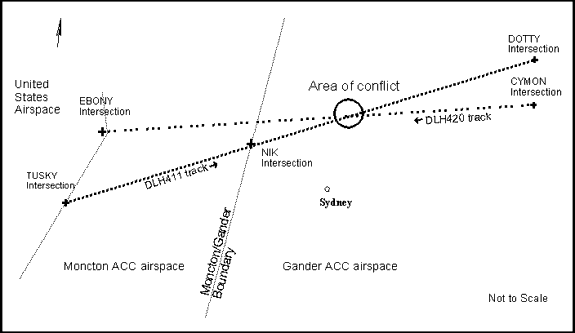 DLH411, also an Airbus A340, was on a flight from Newark International Airport, New Jersey, to Munich, Germany, and was routed through Canadian domestic airspace from TUSKY intersection direct to DOTTY intersection. This track would cross the track of DLH420 approximately 95 nautical miles (nm) north of Sydney, Nova Scotia. Moncton, New Brunswick, ACC initiated a radar handoff of DLH411 with the Gander domestic high (west) controller at 1839:32 as the flight was approaching the NIK intersection (located on the Moncton/Gander boundary) and stated that DLH411 was at FL370. One minute eight seconds later, DLH411 established radio contact with the Gander domestic high (west) controller on frequency 133.55 megahertz and confirmed level at FL370. The oceanic portion of the clearance was passed to DLH411 at 1840:48, at which time DLH411 requested FL380 or maximum FL390. After a brief conversation to clarify the request, DLH411 was told that the request for the higher altitude was under consideration. At this point, the first Gander domestic high (west) controller was relieved by another controller.