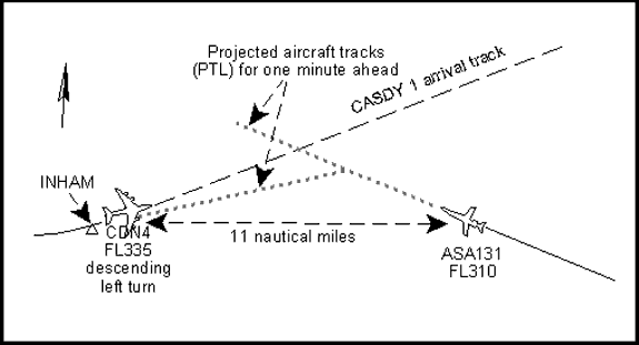 At 0940:00, CDN4 was cleared to descend from flight level (FL) 350 to 17 000 feet; the crew reported leaving FL350 at 0941:35. The descent clearance made no reference to ASA131. At 0942:27, CDN4 was near the INHAM intersection, in a descending left turn to intercept the CASDY ONE arrival track, when the crew sighted ASA131. (See Figure 1.) Shortly thereafter, the crew of CDN4 received a traffic alert and collision-avoidance system (TCAS) traffic advisory (TA), followed by a TCAS resolution advisory (RA) to climb. Because the intruder aircraft was in sight and there was no chance of collision, the captain of CDN4 chose not to comply with the TCAS RA and continued to descend. This decision is in accordance with the Canadian Airlines Flight Operations Manual. CDN4 then initiated contact with the west sector controller to advise him of the situation. At approximately the same time, the crew of ASA131 received a TCAS TA, visually confirmed that the descending Boeing 747 would cross behind their aircraft, and took no further action. Radar data indicate that, at 0943:20, CDN4 passed approximately 1 nautical mile behind and 700 feet above ASA131.