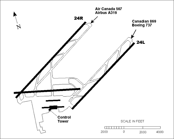 Air Canada flight 381 (ACA381), a Bombardier Regional Jet, was on approach to runway 24 right (24R) at Montréal International Airport (Dorval), Quebec. Meanwhile Air Canada flight 567 (ACA567), an Airbus Industrie A319, was preparing to depart Dorval en route to Denver, Colorado. ACA567 contacted the clearance delivery controller at 0833 eastern daylight time and was issued an instrument flight rules clearance, with departure instructions that specified runway 24 left (24L). During the clearance readback, a pilot of ACA567 read back runway 24R instead of 24L, but the controller did not challenge the change in runway. When ACA567 contacted the ground controller (the same person as the clearance delivery controller), the controller instructed ACA567 to taxi to runway 24R, with later instructions to contact the tower once in the holding bay of 24R.