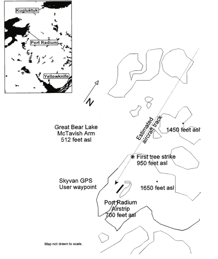 When the aircraft failed to arrive at Yellowknife, Search and Rescue (SAR) were alerted and a search was begun. At 2202 SAR personnel confirmed that the SAR satellite was picking up an emergency locator transmitter signal in the vicinity of Port Radium. SAR aircraft were directed to the signal location and found the signal source but were not able to see the wreckage because of fog and freezing rain. The wreckage was found at 1309 the following day. The aircraft had struck the top of steeply rising hills along the east shore of Great Bear Lake, approximately 2.9 nautical miles northeast of the Port Radium airstrip. The crash site is approximately 440 feet above the lake surface and 250 feet above the airstrip elevation (see Appendix A). The aircraft was destroyed, and the three persons on board were fatally injured.