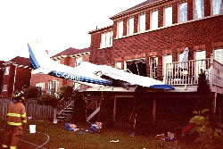 During the take-off and the initial climb, the pilot did not observe any abnormalities except that the carburettor heat control knob was slightly extended. He pushed the control knob in and kept his hand on it to ensure that it stayed fully in (OFF). He did not detect any degradation of power before the engine stoppage. During the forced approach, the pilot attempted two engine restarts without success. He then moved the fuel selector to OFF before impact. The aircraft turned left toward a residential area and struck a house approximately 1.4 nautical miles west-northwest of the Toronto / Buttonville Municipal Airport, Ontario. After the aircraft came to rest on the back deck of the house (Photo 1), one of the occupants of the house assisted the pilot in exiting the aircraft. The aircraft windshield broke during the crash, and the pilot exited through the front of the aircraft. Numerous suitable forced landing sites were available off the departure end of Runway 33 had the aircraft continued straight ahead or altered course slightly to the right.