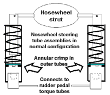 The aircraft is equipped with two nose gear steering tube assemblies, a right and a left. The purpose of these assemblies is to allow rudder operation to continue when the nosewheel centres and locks upon oleo extension at lift-off. These assemblies are similar in appearance to a shock absorber and incorporate a built-in, pre-load spring which operates when the unit is placed under tension. Each assembly connects the left or right rudder pedal torque tube to its respective side of the nose gear steering collar. Each rudder pedal torque tube is also connected aft to the rudder via cables, which form a closed loop system (Appendix A).