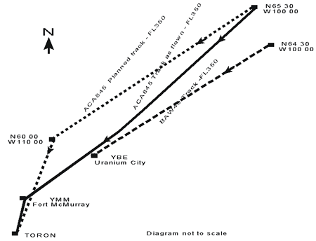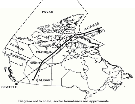 Two aircraft on parallel courses entered Canadian airspace over Baffin Island, Nunavut, 60 nautical miles apart. British Airways Flight BAW49, a Boeing 747-200, was en route from Heathrow, London, United Kingdom, to Seattle, Washington, USA, at flight level 330. Air Canada Flight ACA845, an Airbus A340-300, was en route from Frankfurt, Germany, to Calgary, Alberta, at flight level 350. BAW49 was eight minutes ahead of ACA845. To provide vertical separation from northbound polar traffic, BAW49 was to be issued climb clearance to flight level 350. However, to ensure continued lateral separation between BAW49 and ACA845 at that flight level during a later portion of the flight, ACA845 first had to be rerouted. At 1820 Coordinated Universal Time, ACA845 was issued an amended routing and BAW49 was then cleared to climb to flight level 350. At 1945, the crew of ACA845 advised that they had traffic in sight on their left and were altering course to the right. The two aircraft came within approximately 7 nautical miles of each other at the same flight level where 20 nautical miles lateral or 2000 feet vertical separation is required.