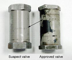Both valves were tested at the component manufacturer's facility in Irvine, California. The minimum flow requirement for the P/N 3-744-75 valve is 110 cubic centimeters per minute (cc/min) with a flow rate of 5 inches of solvent. The flow rate for the approved P/N 3-744-75 valve was measured at 132 cc/min with the flow beginning at approximately 4 inches of solvent. The flow rate for the non-approved valve was measured at 36 cc/min with the flow eventually beginning at 5 inches of solvent, after waiting a few seconds.