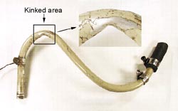The second anomaly was a significant kink in a section of the aluminum main engine fuel feed line (P/N C2P1017), mounted directly behind the engine oil cooler temperature regulating valve. The valve controls the flow of oil through the cooler. The kink was located on a bend in the line and had reduced the size of the line to approximately ½ of its original diameter. The fuel line was located in a protected area of the fuselage and would not have been damaged from impact forces. As a result, the kink was believed to be damage caused during an unspecified maintenance action at some unknown time prior to the occurrence (see Photo 2).