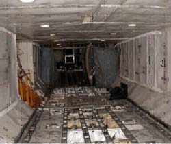 There are two cargo compartments on the passenger version of the Boeing 767: the forward compartment located ahead of the wings and the aft compartment located behind the wings. The aft compartment is subdivided into a main section and a bulk cargo section (see Photo 2). The bulk cargo section is at the aft end of the aft compartment and has an aluminum sloping floor due to the geometry of the aircraft. The bulk cargo area is separated from the main section by a cargo-restraining net and can be accessed independently through a door on the left side of the aircraft. There are six roller tracks with power drive units (PDUs) to facilitate moving cargo/baggage containers longitudinally through the cargo compartments. The tracks are located at buttock line (BL) 44, BL 22 and BL 6 left and right. The PDUs are controlled by externally accessed controls located behind a panel, adjacent to the cargo compartment door, on the right side of the aircraft.