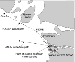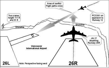 After the tower north controller cleared JAL17 for take-off, he attempted to manipulate the electronic flight progress strip on the extended computer display system to show that the aircraft had departed. This system is linked to all Vancouver tower positions and the terminal control unit and cuts down on verbal communications. While JAL17 was still on the take-off roll, the tower north controller saw an aircraft inbound from the northwest. He queried the tower south controller, who advised that it was a Pacific Coastal flight inbound for Runway 12. The tower south controller asked the tower north controller what action to take. The tower north controller recommended instructing the inbound aircraft to keep the speed up, because it now appeared that the inbound aircraft would cross the departure path of Runway 26R ahead of JAL17 (Figure 2).