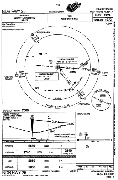 - For undetermined reasons, the aircraft descended below the minimum safe altitude as prescribed on the NDB 25 approach for High Prairie and struck the terrain.
