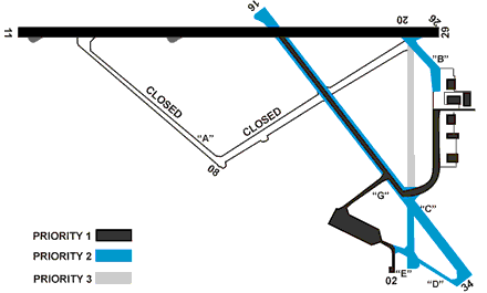 St. John's Airport is a certified, controlled airport. The airport has three runways - 11/29, 16/34, and 20/02, and all three runways are used throughout the year. Snow removal and winter runway maintenance priorities are established in the St. John's Airport Winter Maintenance plan. Because of its Category II instrument approach capability, and unless wind conditions clearly favour Runway 16/34, snow clearing efforts are initially focussed on preparing Runway 11 and the associated runways and taxiways that are necessary for access. The various airport surfaces are designated under one of three priorities for snow clearing (see Figure 1). Priority 3 surfaces are cleared last. Runway 02, north of taxiway Charlie to the entrance to taxiway Bravo, is designated as a priority 3 surface when either Runway 11/29 or 16/34 is active.
