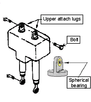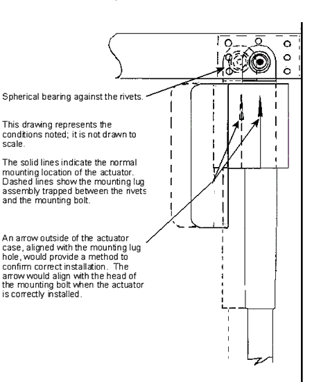 When one upper mounting lug is correctly placed within the airframe attachment structure, the geometry of the actuator ensures that the second lug will be correctly positioned. During installation, if a small-diameter pin were inserted through the attachment structure for one mounting lug, the weight of the actuator could be suspended from that pin while a close-tolerance bolt was installed at the other mounting lug. The pin could then be removed and a high-tolerance bolt installed in its place. Additionally, if arrows were marked on the sides of the actuator, in line with the holes in the spherical bearings (see Appendix A), the correct positioning of the actuator could be easily determined. There were no published warnings to indicate that special attention is required when installing actuator mounting bolts, nor were there procedures outlined to ensure the correct installation of the high-tolerance bolts.