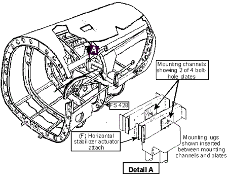The airframe mounting structure for the horizontal stabilizer trim actuator consists of four channel-and-plate assemblies that are aligned fore-and-aft and installed between a former, located at station 418.900, and a bulkhead located at station 428.335, in the upper section of the aircraft tail. To provide a bolt hole through which close-tolerance mounting bolts are installed, a plate is rivetted to each channel. There are two upper mounting lugs on the horizontal stabilizer trim actuator; both mounting lugs include a spherical bearing. To attach the trim actuator to the upper airframe structure, a separate high-tolerance bolt is installed through the holes in each set of paired channels and through the spherical bearing for each of the mounting lugs. The installer is on his knees, leaned forward and holding the actuator (approximately 10 pounds) in place, above and ahead. The mounting lugs are hidden from view between their respective channels and the bolts are installed by feel. At any time in the process, the spherical bearings may rotate slightly, making it difficult to insert the close-tolerance bolts. The normal procedure is to insert a bolt through one of the channel pairs and the mounting lug, suspending the weight of the actuator from the airframe mounting structure (see Figures 1 and 2).