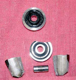 The front engine case was removed and the No. 3 cylinder exhaust roller was found to be excessively worn. The top portion of the cam roller slot tappet guide had split off and broken. The cam roller was measured and found to be worn 0.249 of an inch with a flat spot on one side (Appendix A). The cam ring was inspected and all four exhaust lobes were found to be excessively worn and out of limits. The No. 3 cylinder exhaust valve push rod was inspected and the ball ends were removed to check for the number of adjustment spacers under the ends. Push rods can be lengthened or shortened by adding spacers underneath the ball ends to accommodate valve adjustments during overhaul or cylinder replacement. Two spacers were noted under one end with one spacer found on the opposite end. The single spacer, however, had been installed standing on end and had been forcibly folded over at a right angle.
