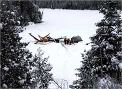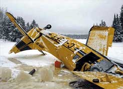 At approximately 1200 EST, the pilot and passengers boarded the aircraft and took off in an easterly direction. The aircraft got airborne near the departure end of the airstrip, and, shortly after take-off, the right wing struck a number of small bushes and the top of a birch tree. The aircraft descended and struck the frozen lake surface, approximately 70 feet below the airfield elevation in a steep, nose-down, right-wing-low attitude. When it came to rest, the aircraft was inverted and partially submerged, with only the aft section of the fuselage remaining above the ice (Photo 2). All of the occupants were wearing lap belts. The pilot and front seat passenger received fatal injuries. The rear seat passenger survived the impact and evacuated the aircraft with some difficulty due to leg injuries. The following morning, about 22 hours after the accident, a local air operator searching for the missing aircraft located and rescued the surviving passenger.