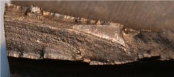 The two missing airfoils from the 8th stage were recovered from the box of miscellaneous compressor airfoils. One airfoil was discoloured, had a rough surface consistent with tumbling, and had a surface that was splattered with particles. Energy dispersive X-ray analysis of the particles adhering to the surface indicated that the particles were predominantly aluminum. By contrast, the other loose stage 8 airfoil had a much smoother surface of uniform color. TSB Engineering Laboratory report LP 114/04 concluded that the discoloured airfoil had dislodged from the disk and was trapped somewhere downstream of the HPC stages. Close examination of the 8th stage disk slots identified one position with very light witness marks from the airfoil tongues and from the retainer; that position was likely occupied by the discoloured airfoil.