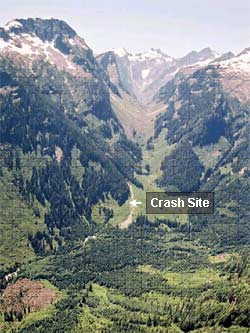 The mountain peaks in the vicinity of the accident site vary in height between 6400 feet and 7400 feet above sea level (asl), and there was some snow at higher elevations, particularly on the north-facing slopes. The wreckage was located at approximately 2100 feet asl on a northwest-facing slope at the juncture of two U-shaped glacial valleys: Tretheway Creek valley and a slightly narrower, unnamed valley. The wreckage was situated about 1000 feet south and 300 feet above Tretheway Creek. The mountainside in the immediate area of the accident site was covered with low, light-green vegetation typically found in sub-alpine avalanche chutes; the predominant vegetation elsewhere in the area was dark, coniferous forest.