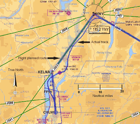 - The first officer was aware from his cockpit displays that considerable distance remained to the Kelowna Airport. He was, however, initially distracted by radio calls and was slow to intervene in the approach to the Vernon Airport.
