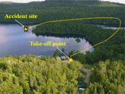 The meteorological conditions were suitable for visual flight, and the winds were calm. The pilot took off from the outfitter's parking at Boucher Lake, where four passengers had disembarked from the helicopter 30 minutes before. At a height of approximately 100 feet above ground level (agl), the helicopter commenced its flight in a south-westerly direction. When the aircraft reached translational speed, the pilot noticed that the power turbine rpm (N2) and rotor rpm (Nr) had decreased from 100 per cent to 95 per cent and were still decreasing. However, he did not hear the low rpm warning alarm. To reduce power demand and increase rotor rpm, the pilot lowered the collective and at the same time lowered the nose to accelerate. A short time later, the N2 indicator showed 85 per cent. The pilot, who was then over trees, steered the aircraft toward Boucher Lake, which was on his left. The aircraft descended over the lake and curved around a peninsula. After flying a distance of about one kilometre, a few feet above the lake, the pilot observed an increase in engine rpm in the normal operating range. However, he concluded that, because of the attitude, speed and altitude of the aircraft, the accident was unavoidable. The pilot raised the nose of the aircraft just before striking the surface of the water. Some of the outfitter's residents rescued the pilot a few minutes after the accident.