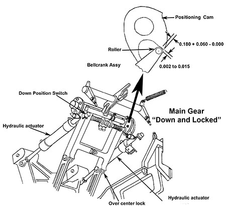 An inboard and outboard hydraulic actuator is mounted on each of the main landing gear assemblies to assist extension and retraction. To prevent the landing gear from collapsing, the position of the bellcrank roller relative to the cam cutout is critical and is determined by adjusting the length of the landing gear actuator rods.