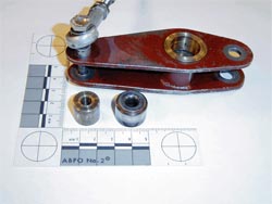 A review of the aircraft technical records showed that the left gear outboard bellcrank roller had been replaced with a part number 5453032-1 roller on 09 August 2004, approximately 209 flight hours prior to the accident. The manufacturer's parts manual shows part number 5453032-1 to be that of a landing gear uplock roller for this type of aircraft's vice bellcrank roller; it is made of a solid bushing material (see Photo 1). The proper bellcrank roller is listed as a part number YCRS-12 bearing, comprised of an outer race running around rollers over an inner race. The YCRS-12 bearing roller is larger in diameter than the one installed.