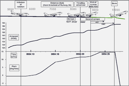 During rotation, the aircraft's lower aft fuselage briefly contacted the runway. A few seconds later, the aircraft's lower aft fuselage contacted the runway again but with more force. The aircraft remained in contact with the runway and the ground to a point 825 feet beyond the end of the runway, where it became airborne and flew a distance of 325 feet. The lower aft fuselage then struck an earthen berm supporting an instrument landing system (ILS) localizer antenna. The aircraft's tail separated on impact, and the rest of the aircraft continued in the air for another 1200 feet before it struck terrain and burst into flames. The final impact was at latitude 44°52′51″ N and longitude 063°30′31″ W, approximately 2500 feet past the departure end of Runway 24, at an elevation of 403 feet above sea level (asl). The aircraft was destroyed by impact forces and post-crash fire. All persons on board (seven crew members) were fatally injured.