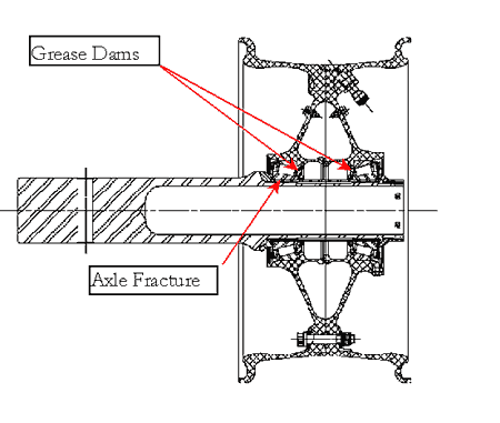 Information obtained from research into roller bearing failures revealed that the lubricant acts as a cushion between the cage and the rollers. The cage keeps the rollers parallel and prevents the roller's tendency to skid sideways with changes in loads. Proper axle nut torque maintains the bearing alignment and pre-loading. A reduction in lubrication, as a result of the grease migrating from the bearing, will increase the cage loads, which may lead to the premature failure of the bearing. It could not be proven that the roller bearing failed due to a lack of lubrication. However, during examination, there was no evidence of grease residue on the inboard bearing. Therefore, it is likely that the depletion of the lubricant was a contributing factor.