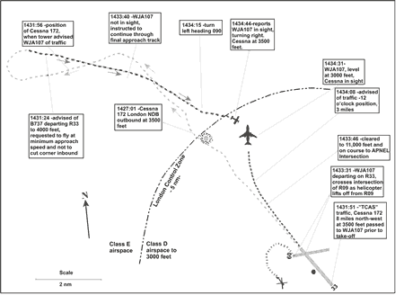 At 1434:26, the ACC controller learned that the Cessna pilot had reported WJA107 in sight and that the Cessna had remained at 3500 feet throughout the simulated approach. The two aircraft passed with 500 feet vertical spacing and 0.6 nm lateral spacing, on a converging course, 4 nm north of London International Airport. WJA107 was still in the London Class D control zone at 3000 feet, and the Cessna was in Class E airspace at 3500 feet. There is a requirement for air traffic control (ATC) to provide traffic information, workload permitting, but not conflict resolution between IFR and VFR traffic operating entirely in Class E airspace. In this incident, both aircraft had authority to operate in the control zone.