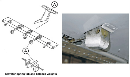 The spring tab system for each elevator is designed to provide aerodynamic assistance to elevator movement. There are two mass balances extending forward of each spring tab leading edge (see Figure 1). Each mass balance assembly consists of two weights bolted together and secured to the arm with two bolts.