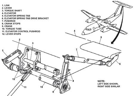 When the elevators are actuated, the control column movements go directly to the spring tab and then to the elevator through the torque shaft (see Figure 2, item 3). With the airplane on the ground and no aerodynamic load, the stiffness of the torque shaft overcomes the weight of the elevator, causing it to move with the control column. The geometry of the actuating hardware causes the elevator to move in the opposite direction to the spring tab. Maximum spring tab deflection is limited by the crank stops (Figure 2, item 8), after which the elevators are moved directly by the control column. Maximum elevator deflection is limited by the lever stops (Figure 2, item 12).