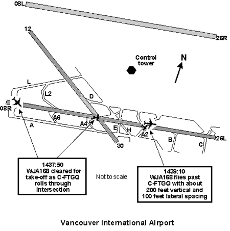 Just after the Cessna crossed the threshold, the TS controller cleared WJA168, then holding at the threshold, to take position on Runway 08R. When the TS controller saw that the Cessna had touched down, he instructed the pilot to exit the runway to the right at Runway 12, which was 4500 feet from the threshold of Runway 08R, and to contact Vancouver ground control. The pilot correctly read back this instruction. Seconds later, when the TS controller assessed that the Cessna was turning off onto Runway 12, he cleared WJA168 for take-off. However, the Cessna pilot had passed the exit to Runway 12 and remained on Runway 08R. At about 1437 Pacific standard time, with WJA168 now on its take-off roll, the TS controller was advised that the Cessna was still on the active runway. He immediately instructed the Cessna pilot to vacate the runway quickly at the next taxiway and to stay to the right-hand side of the runway. WJA168 passed abeam of the Cessna, about 200 feet above and 100 feet to the left, while the Cessna was still on the runway at the entrance to Taxiway A2.