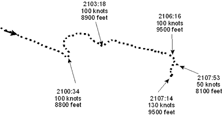 Radar data show that the aircraft was first detected at 2043:56 Pacific daylight timeFootnote 1 at a position 13 nautical miles (nm) southeast of Kelowna Airport, on an east-southeast heading, climbing through 5700 feet, with a ground speed of 100 knots. The aircraft climbed steadily on that heading until 2100:34 when, at an altitude of 8800 feet and a ground speed of 100 knots, it made a fairly abrupt turn to the left reaching a heading of 325° True (T) before correcting back to the east-southeast heading. At 2103:18 the aircraft made another left turn, reaching a heading of 052° T before again correcting to the east-southeast heading. At 2106:16, the aircraft reached 9500 feet and 25 seconds later began a turn to the south. At 2107:14 the event began. The last radar return was at 2107:53 as the aircraft descended through 8100 feet.