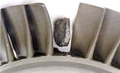 The third-stage turbine wheel showed significant leading-edge impact damage. The trailing edge was unremarkable and the curvic coupling was clean with minimum fretting wear. Minimum wear was observed on the inner stage seal.
