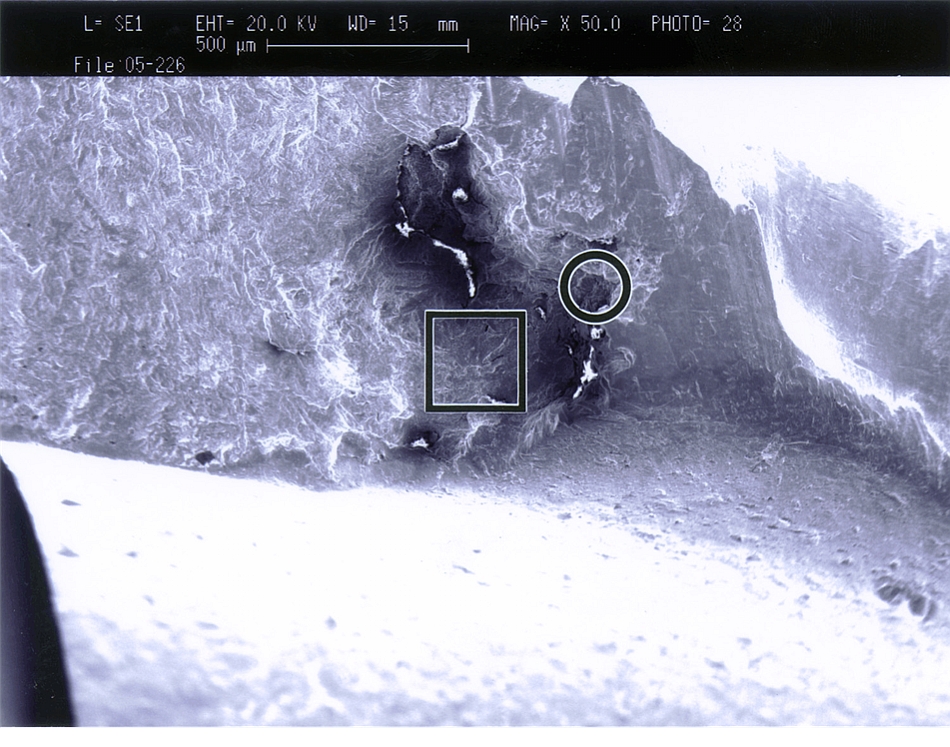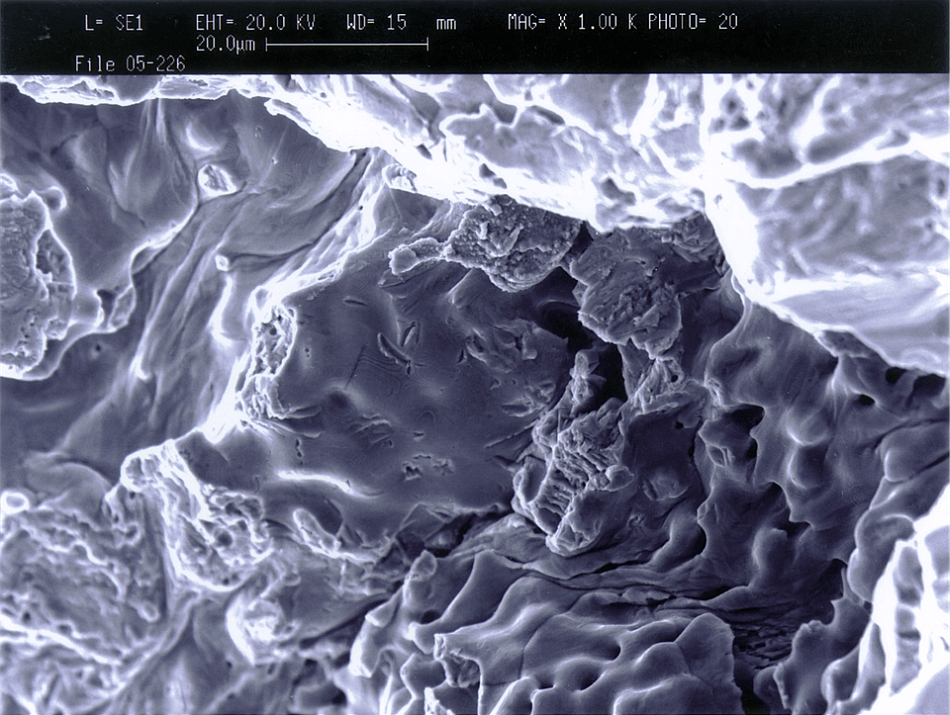 Optical microscopic examination of the blade fractures from the 2nd and 3rd stage rotors predominantly revealed overload features. All of the blades had failed at or slightly above the blade root and the blade stub remnants were bent opposite to the direction of rotation. However, one blade fracture in the 2nd stage was unique in that it showed a flat, transverse fracture surface from the leading edge back towards mid-spa that changed to a slanted fracture towards the trailing edge. Areas of the fracture surface towards the leading edge showed faint striations indicating a progressive failure mode. This blade fracture was sectioned from the rotor for detailed SEM examination.